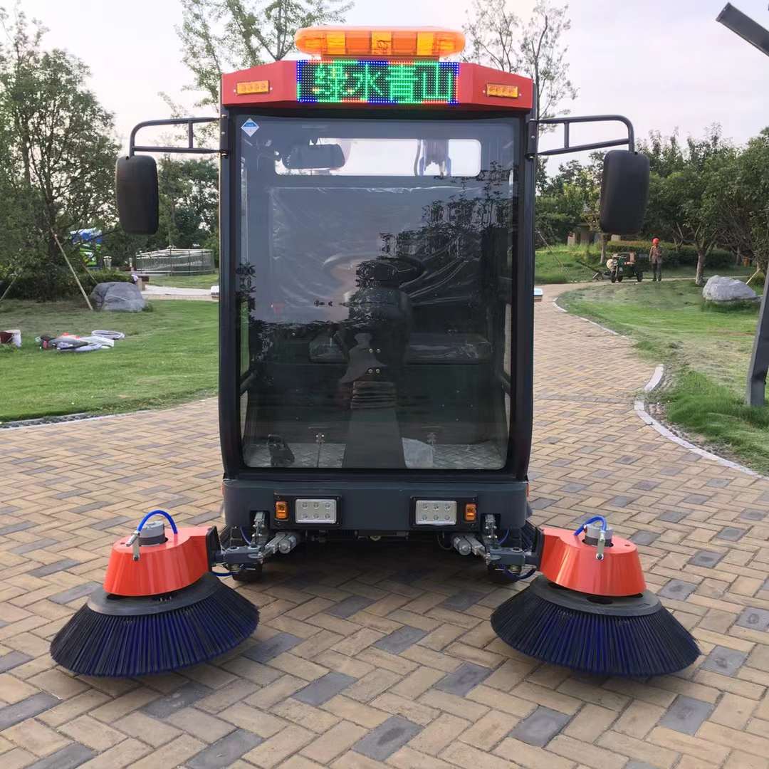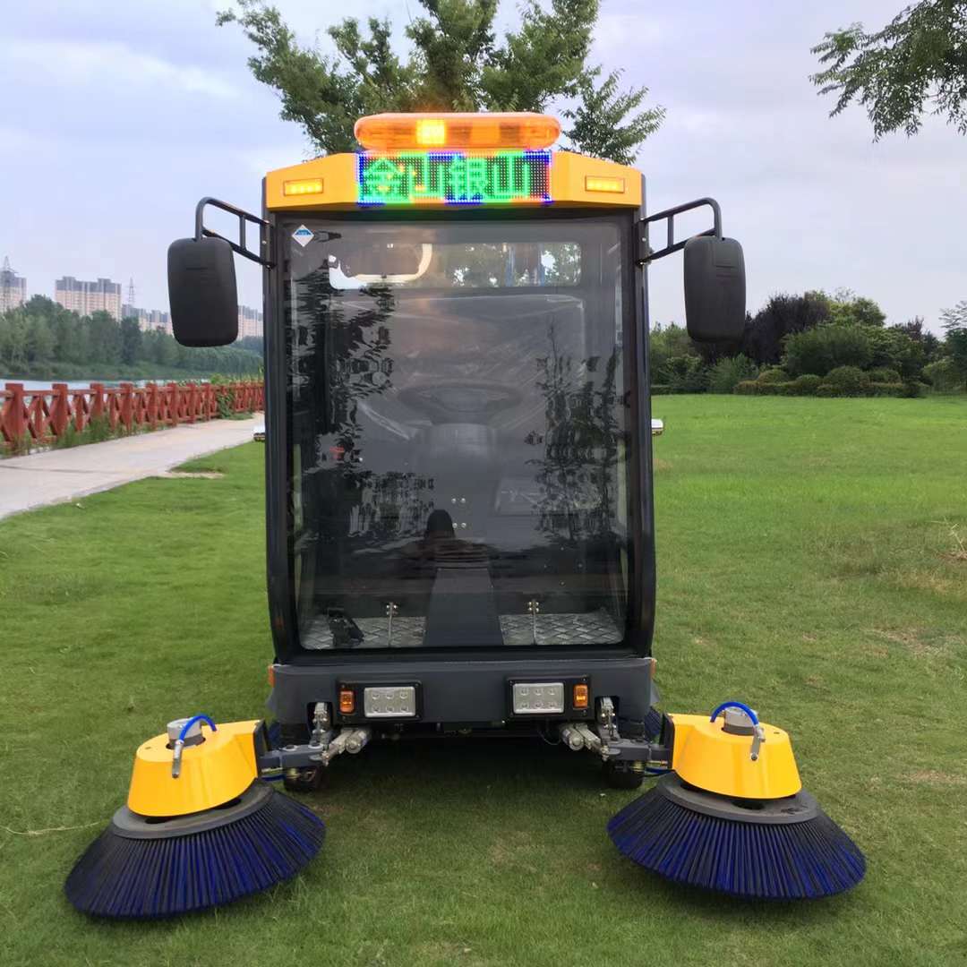 2.前后配有LED汽车大灯及后尾作业安全提示灯,让夜晚清扫更明亮更安全;前置喷水装置,液压减震,前后实心防扎轮胎;