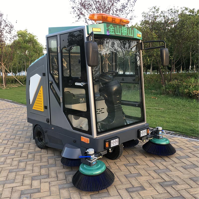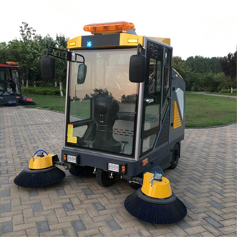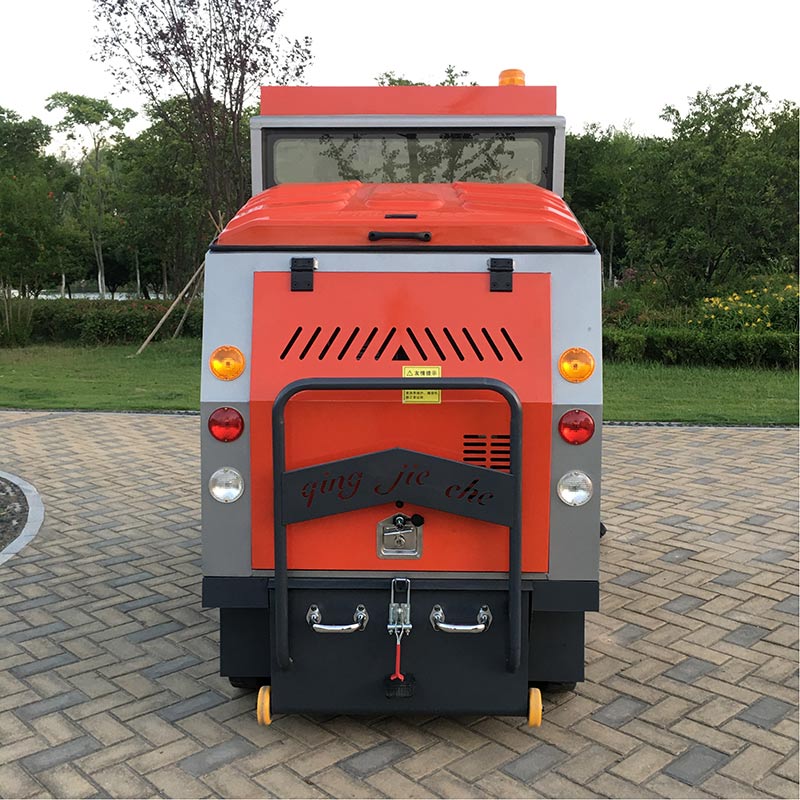 1.前后配有LED汽车大灯及后尾作业安全提示灯,让夜晚清扫更明亮更安全;前置喷水装置,液压减震,前后实心防扎轮胎;